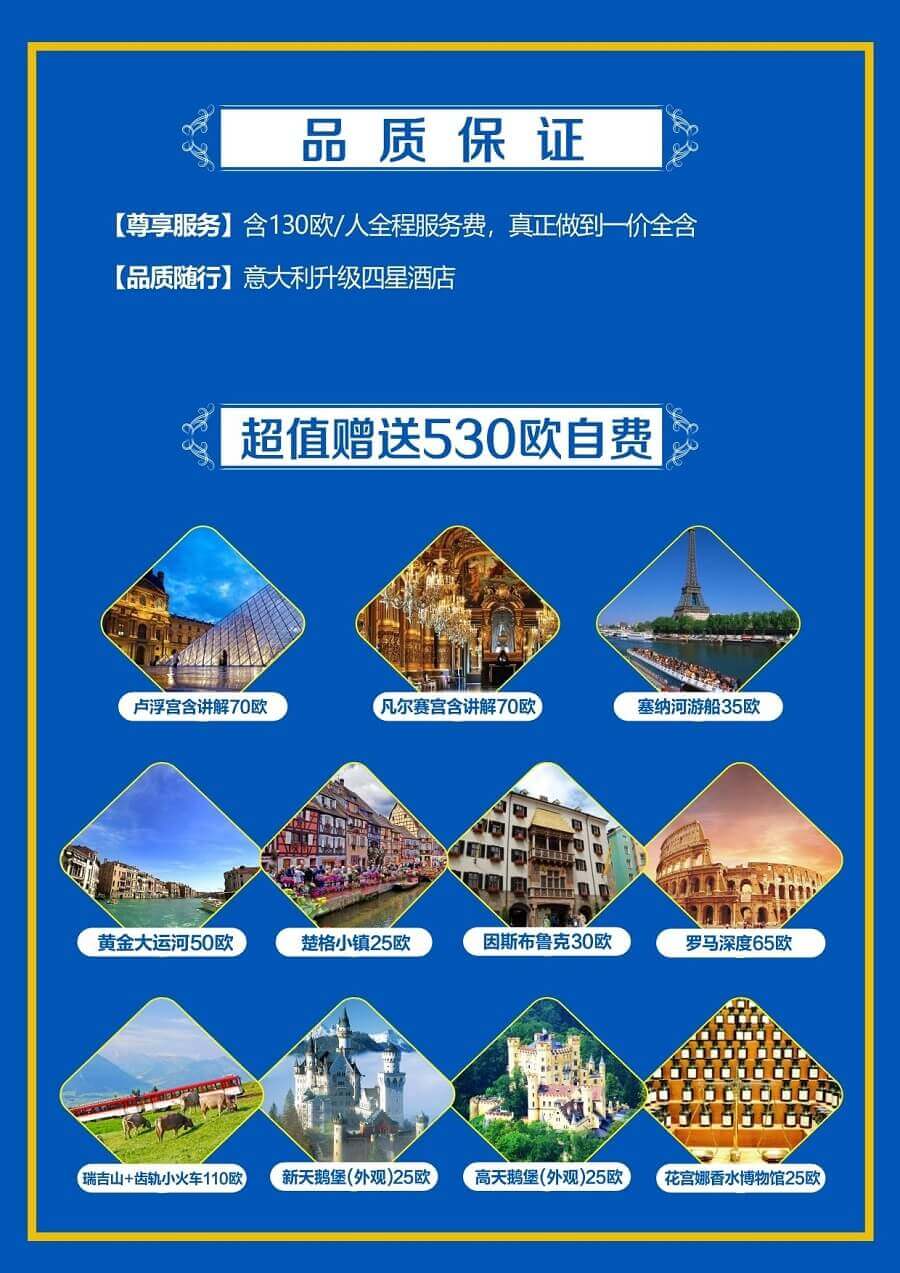 6、退税说明:退税是欧洲对非欧盟游客的一项优惠政策,一些商店当场退税,一些商店需要出欧盟时在机场办理退税,导游会向您介绍退税详情并协助您,但这毕竟是欧洲政府运作的,领队不能承担退税失败的任何赔偿。购物属个人行为,如果由于商店和海关无合同或飞机晚点、银行关门、海关检查时间紧迫等原因不能及时退税的,很抱歉我社不能承担相关退税责任。(若选择退税到信用卡或者某些已在商店里拿到了现金退税,都必须将已盖海关章的退税单寄回退税公司,存在一定的风险,若退税单在邮寄的过程中丢失,则无法获得退税款项,因此产生的损失,很抱歉我社不能承担!为了方便后期查询退税情况,请在邮寄税单之前先将税单拍照留底)。