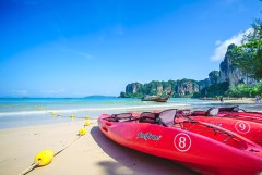 用完早餐后,我们在酒店集合,学习十分钟的泰语,包括一些基本的⽇日常问候语句句。早上九点半出发,前往Borthor溶洞洞,它位于甲⽶米以北北,置于两座⼭山峰之下,在溶洞洞中除了石笋和钟乳石,还有史前壁画,此外在岩洞洞内曾发现的人骨,据传是古代洪水时被困在洞里的人的残骸。在热带雨林划着皮划艇是你和大自然亲密接触的最好方式。在皮艇上能看到平时在陆地看不不到的奇特风景,如岛屿、岩洞洞、水鸟、飞鱼、奇特的植物等。午餐后,复习早上学到的泰语。下午自由活动。