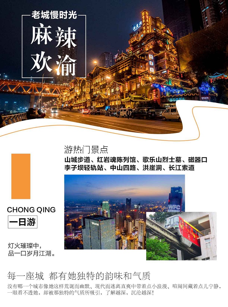 注:此行程为当地一日游。另可代订成都-重庆往返动车、重庆住宿。可安排重庆2日、3日、4日游